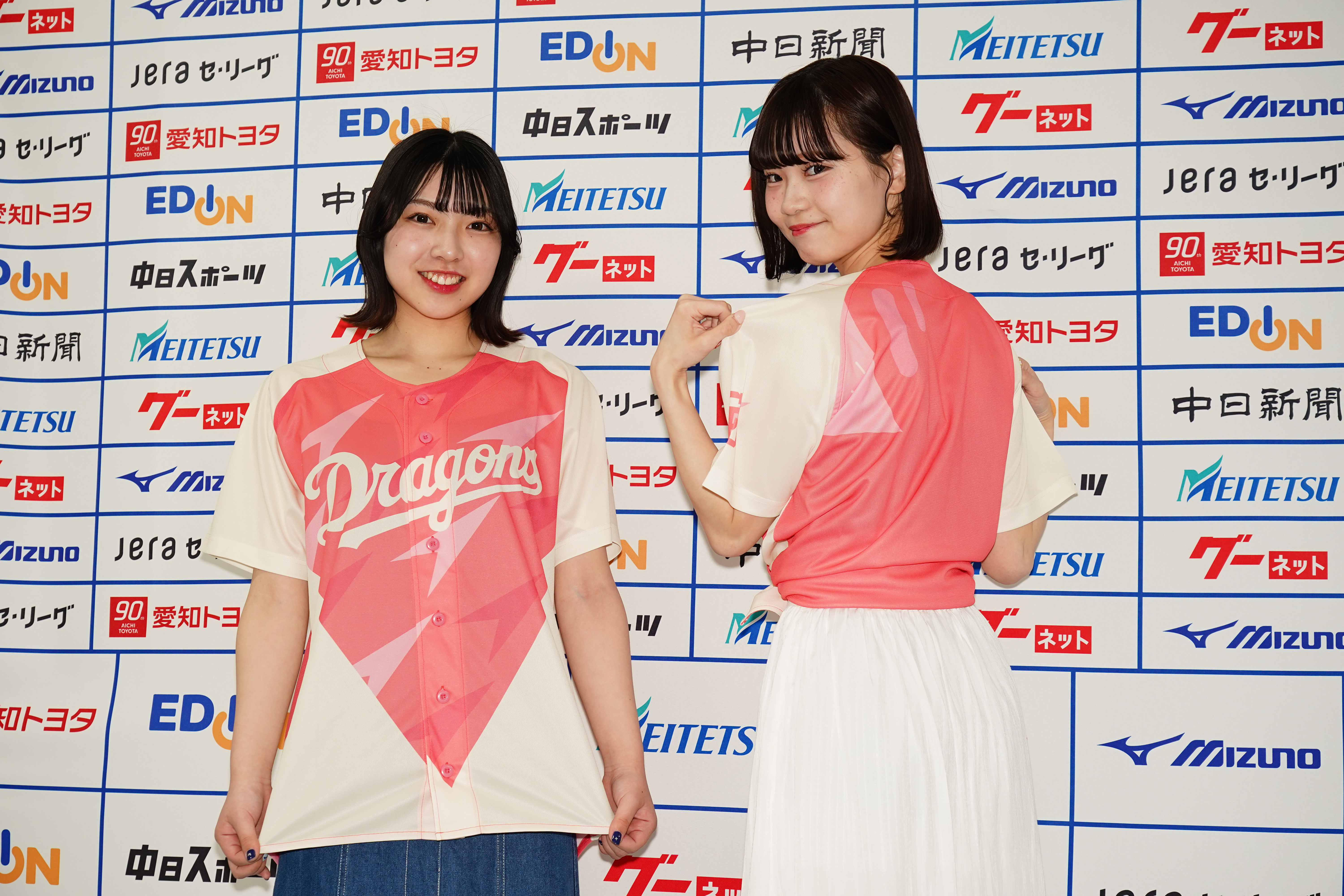 中日ドラゴンズが「ガールズシリーズ」で女性来場者に配布している恋をテーマにしたユニホームで、名古屋芸術大学の学生がデザインした4種類のデザインが並びます。