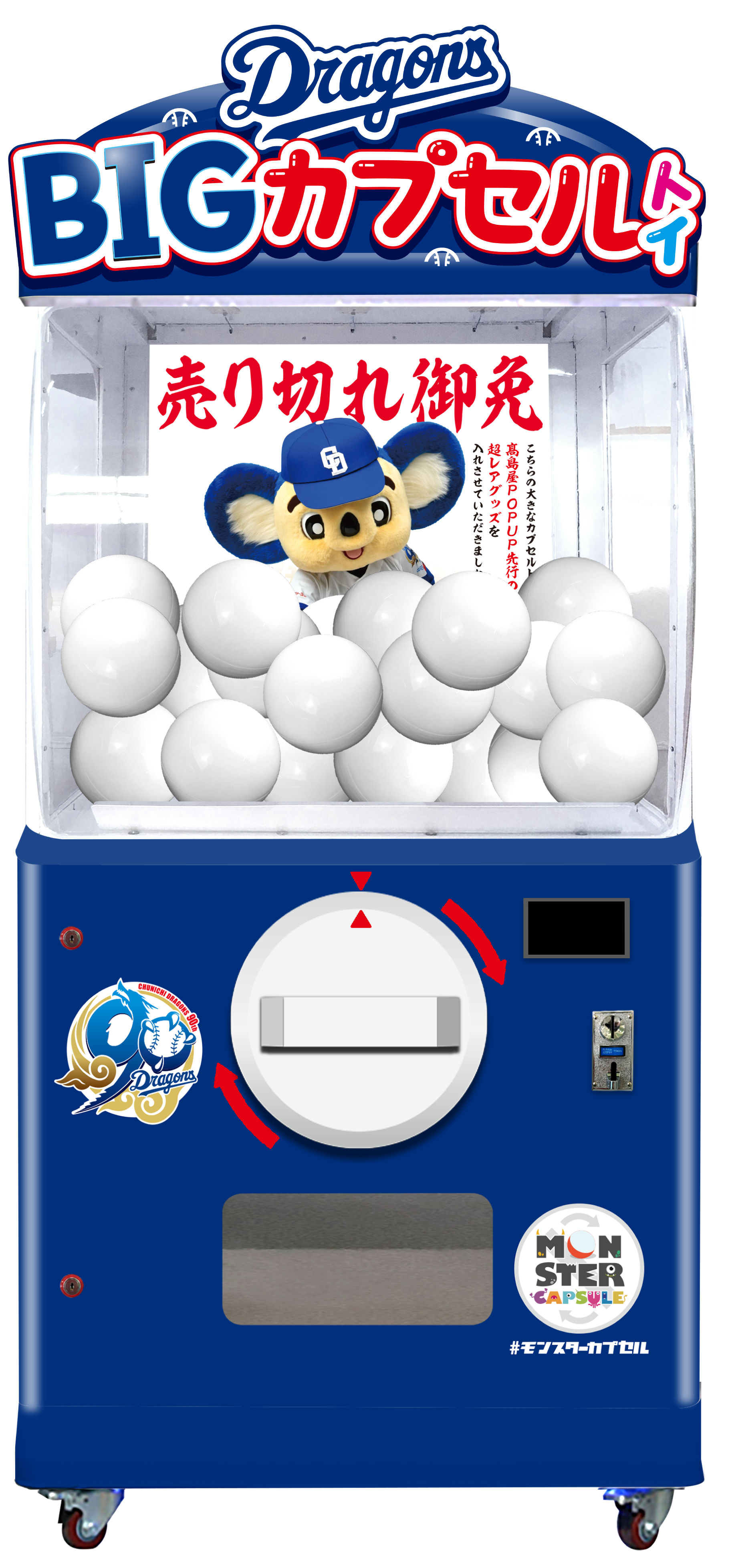 オリジナルグッズも当たる「ドラゴンズBIGカプセルトイ」は、高さ2mというインパクトにも驚かされます。
