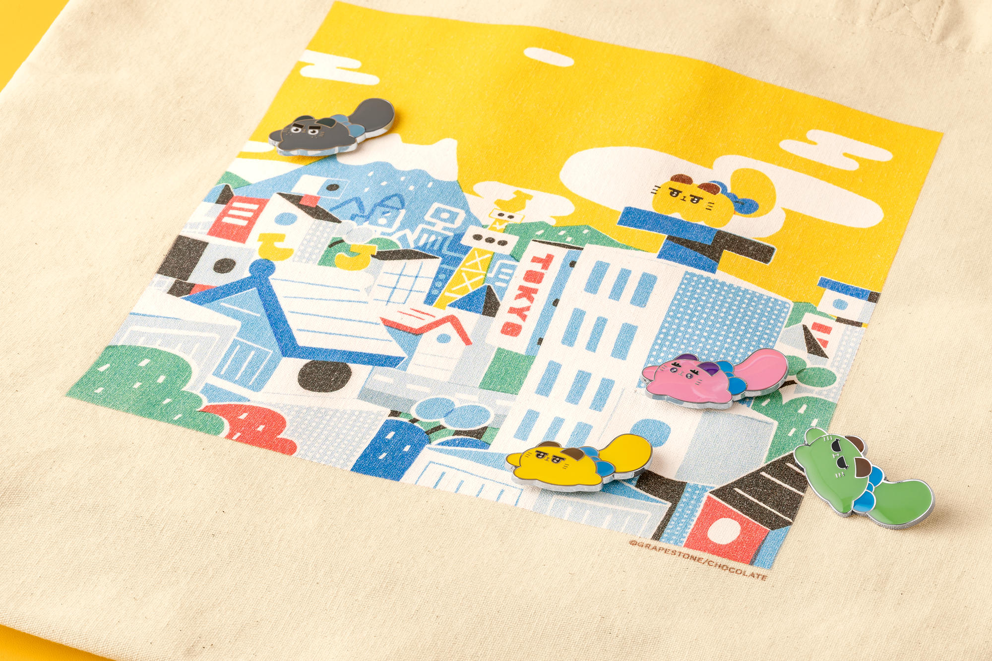人気のぬいぐるみ(1,561円)はもちろん、「ばにゃ奈」が暮らすNEKOTOKYOを描いたトートバッグ(1,381円)や、全6種類のピンバッジ(各601円)など、猫好き・キャラもの好きにはたまらないラインナップです。
