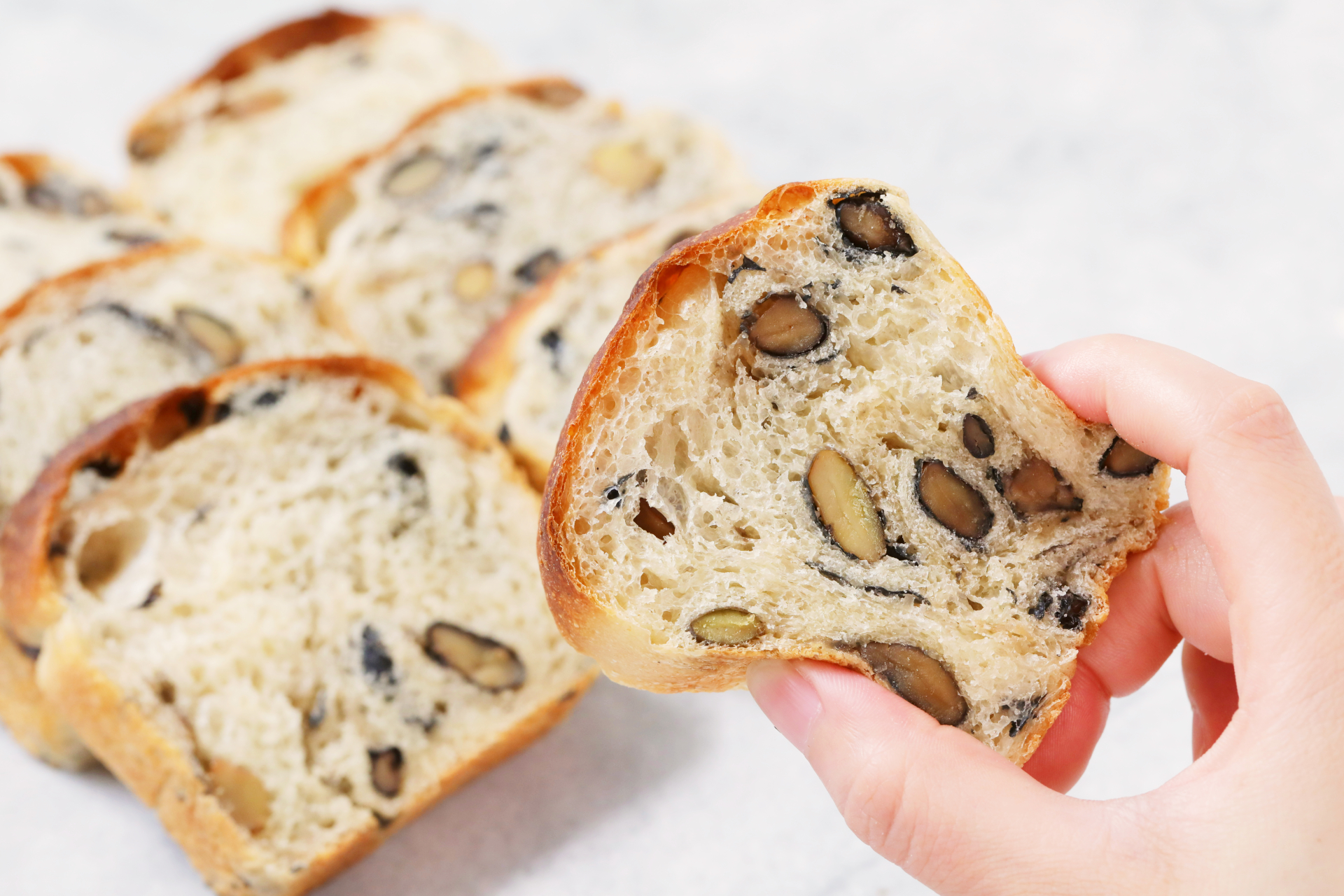その生地に、ほっくりとした食感の黒豆かのこを練りこんで焼き上げたのが、今回の「黒豆ブール食パン」です。