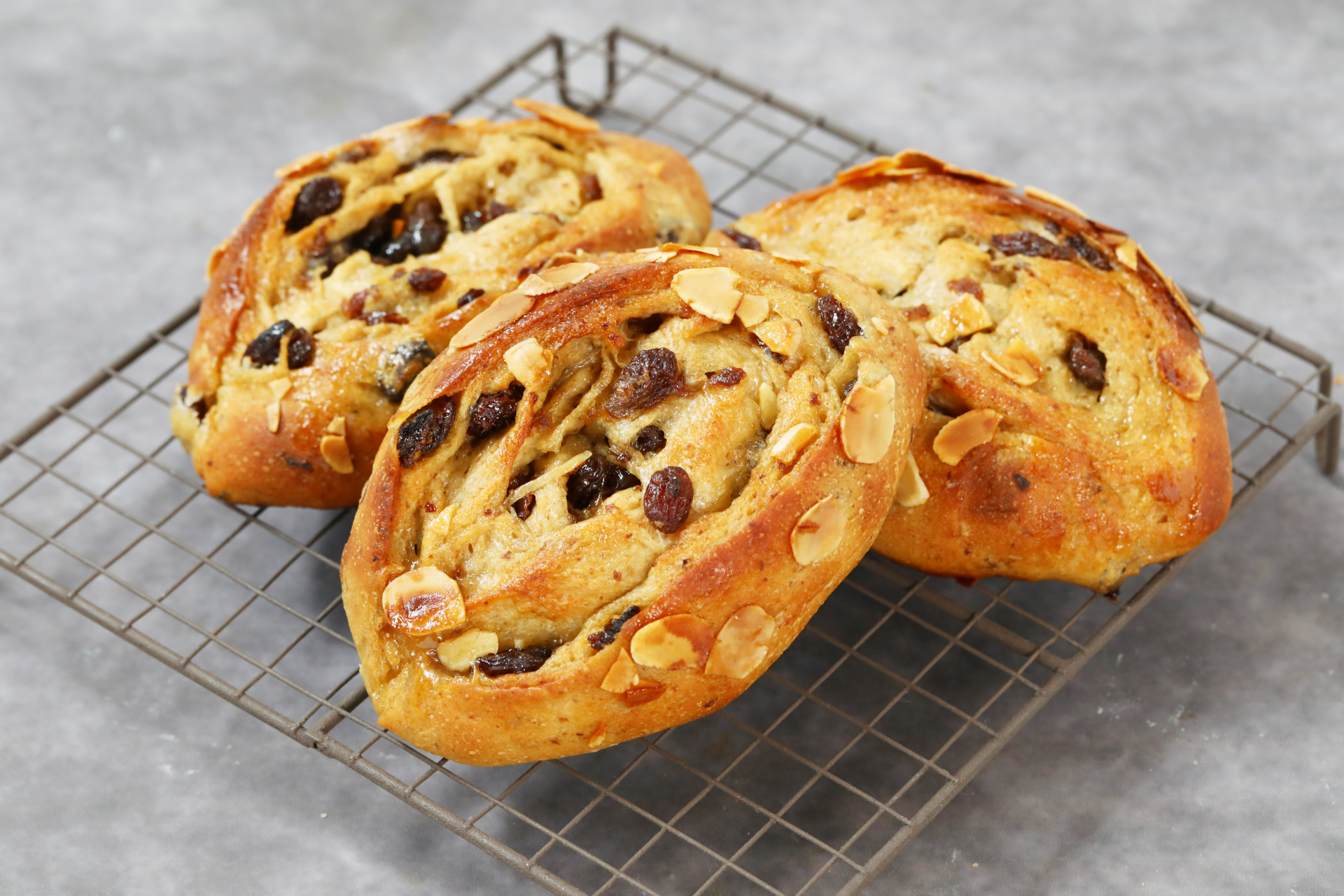 生地に自家製のラム酒漬けレーズンを練りこみ、はちみつバターとスライスアーモンドをトッピングして焼き上げています。
