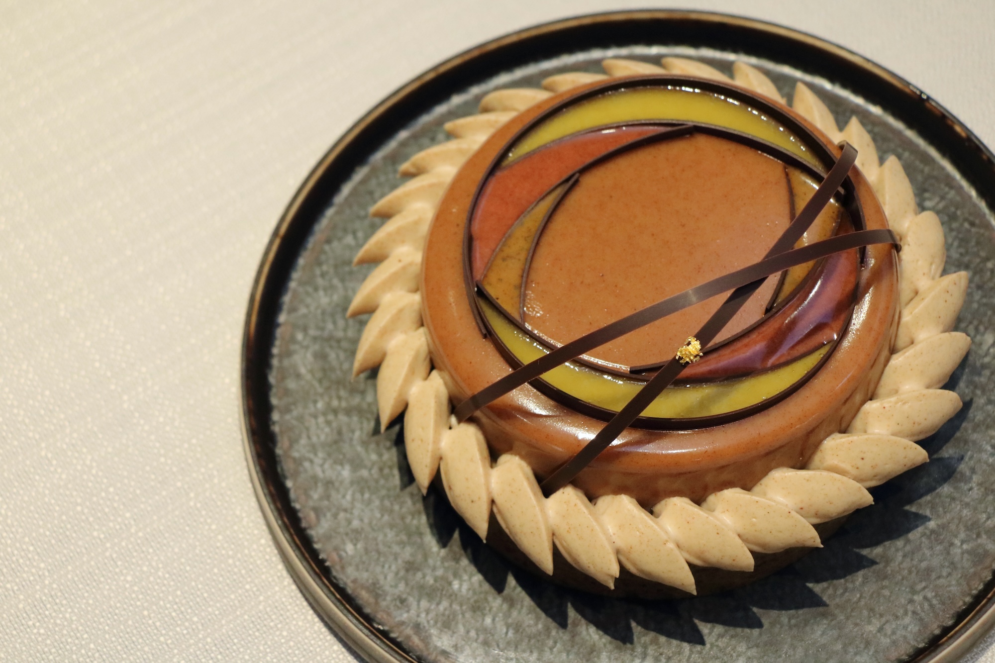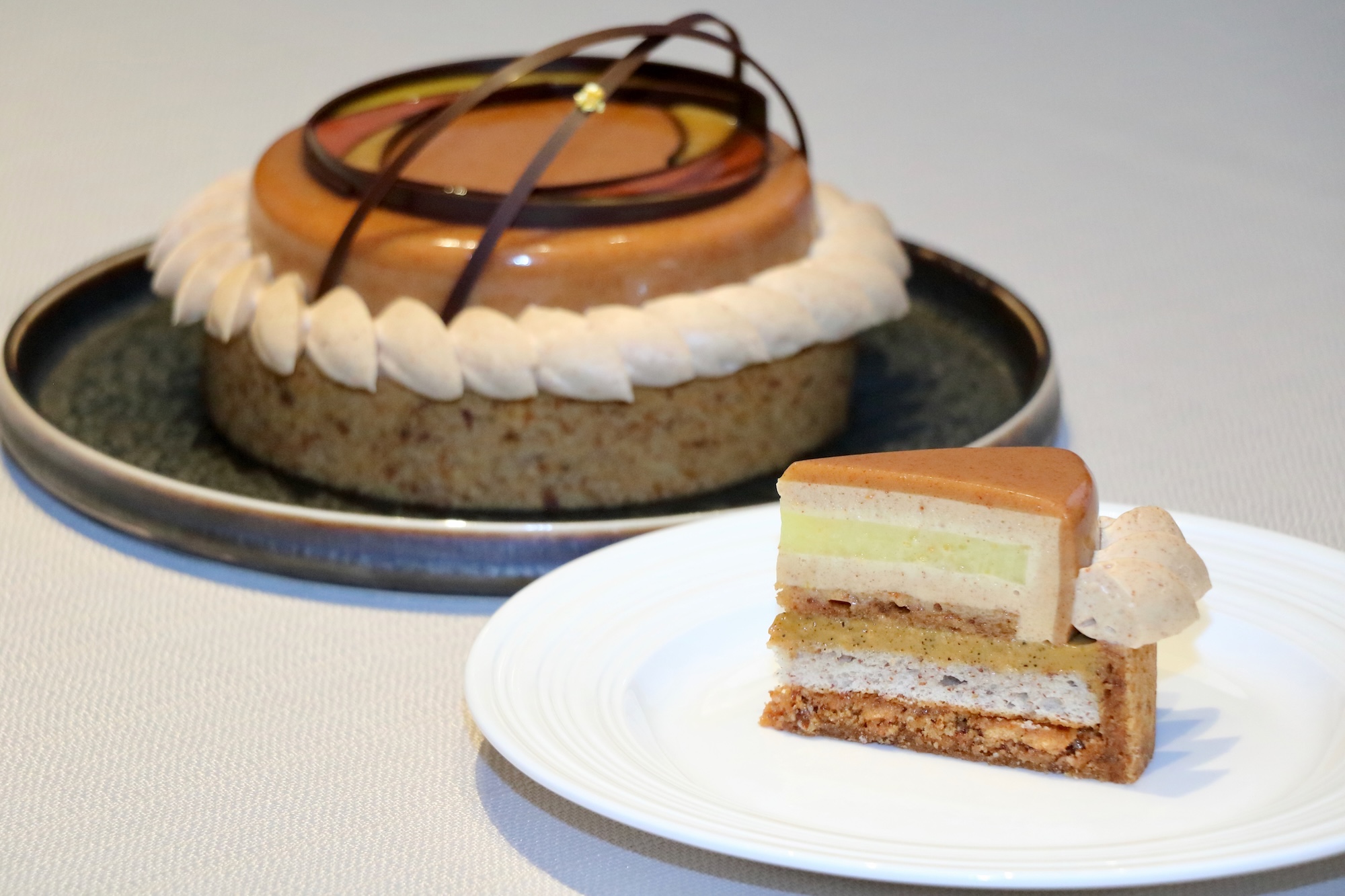 「遙」という名に、“想い”や“余韻”、人と人との“つながり”というメッセージを込めたというケーキ。特徴は、ナッツをキャラメリゼしてペースト状にした自家製プラリネと、柚子、紅茶などを組み合わせた12層が織りなす味わい。豊かに移り変わっていく風味や香りは、まさに芸術的。ひと口食べるたびに、新鮮な驚きと幸せが口の中に広がります。