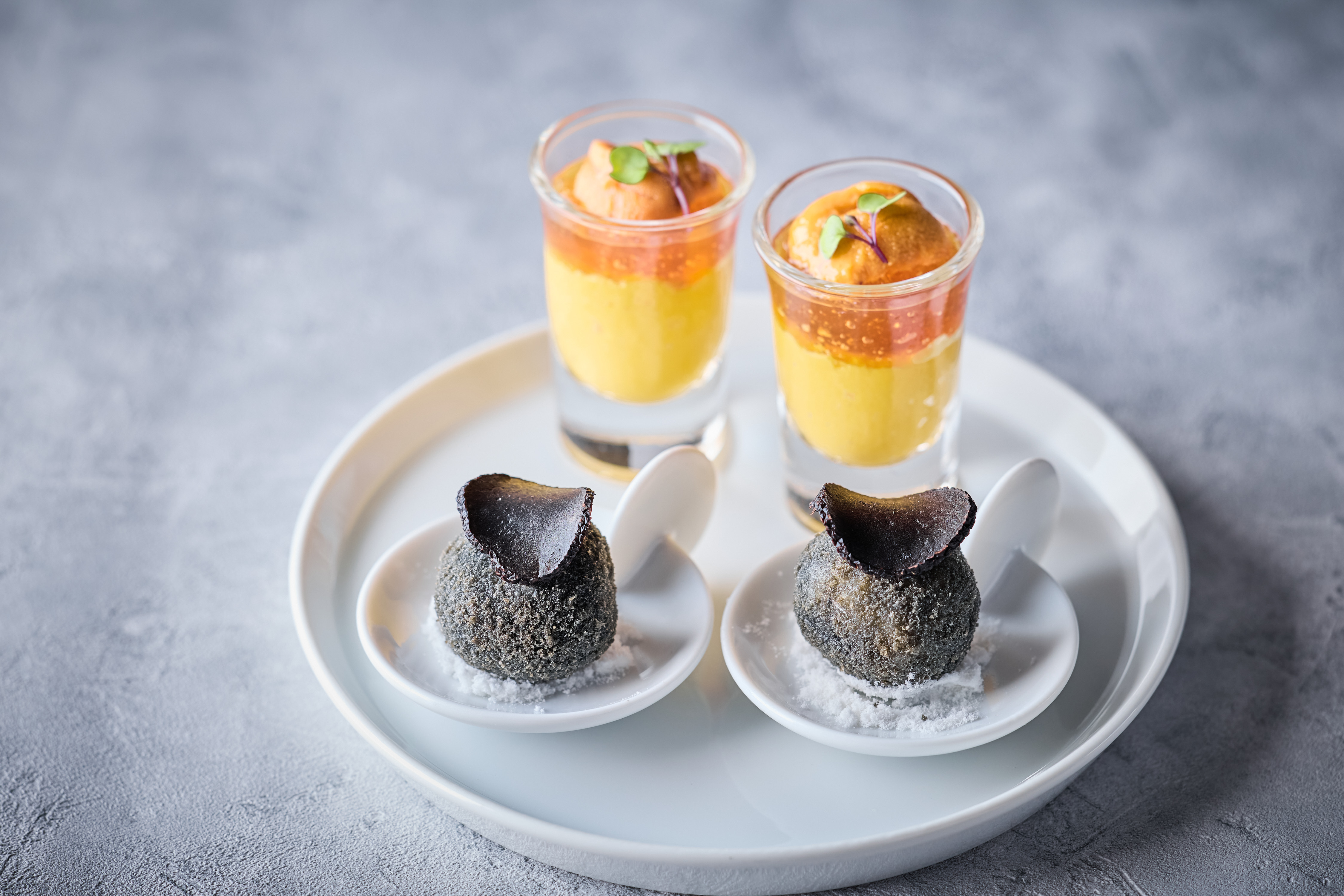 黒トリュフ、フォアグラ、キャビアという世界三大珍味を目にも美しく、アートのように仕立てています。
