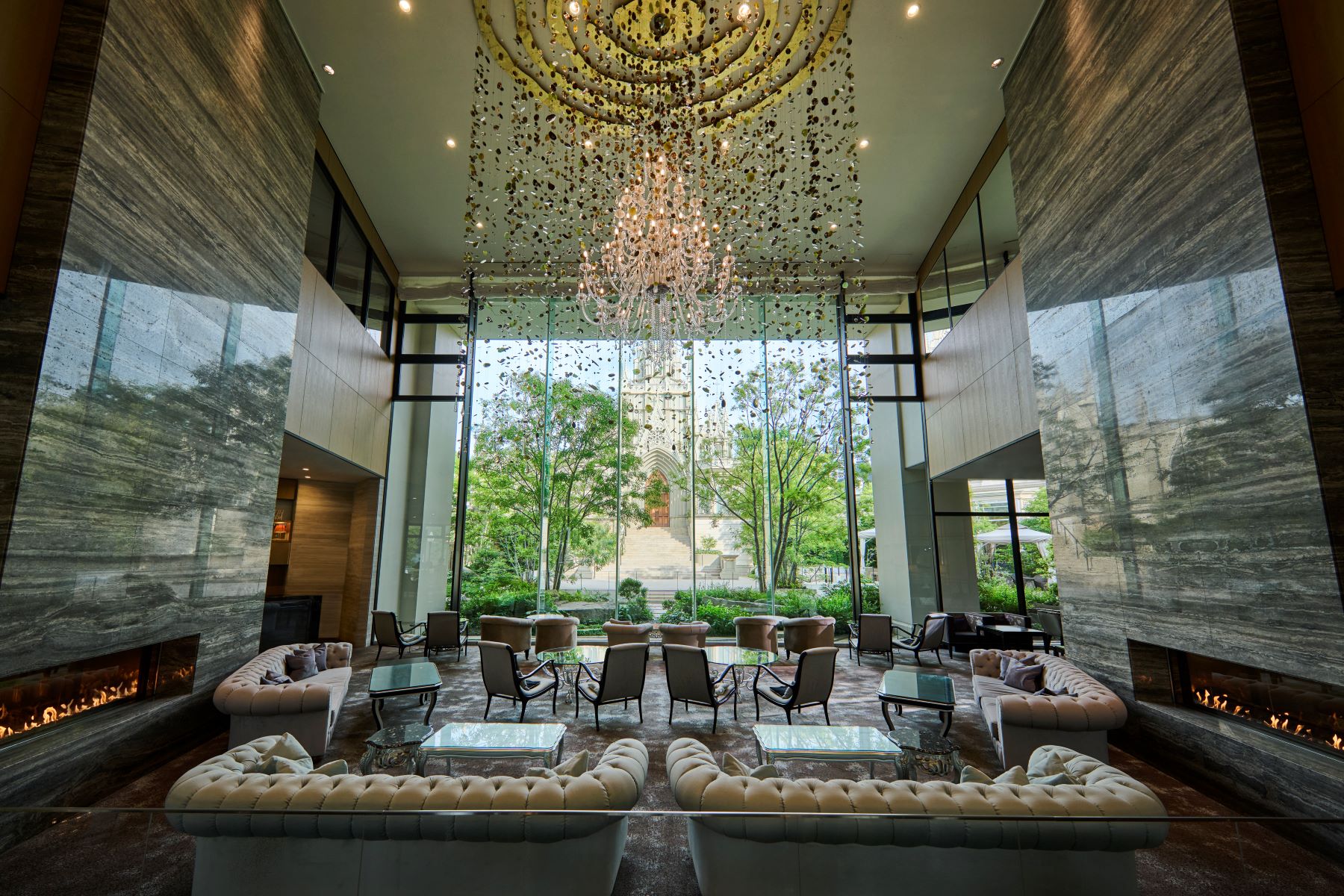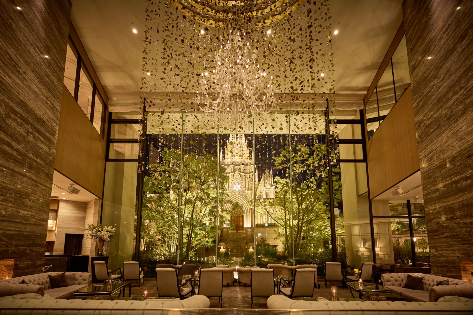 『ストリングスホテル 名古屋』のシンボルともいえる大聖堂を望むラウンジと、バックに煌めくイルミネーションも魅力です。