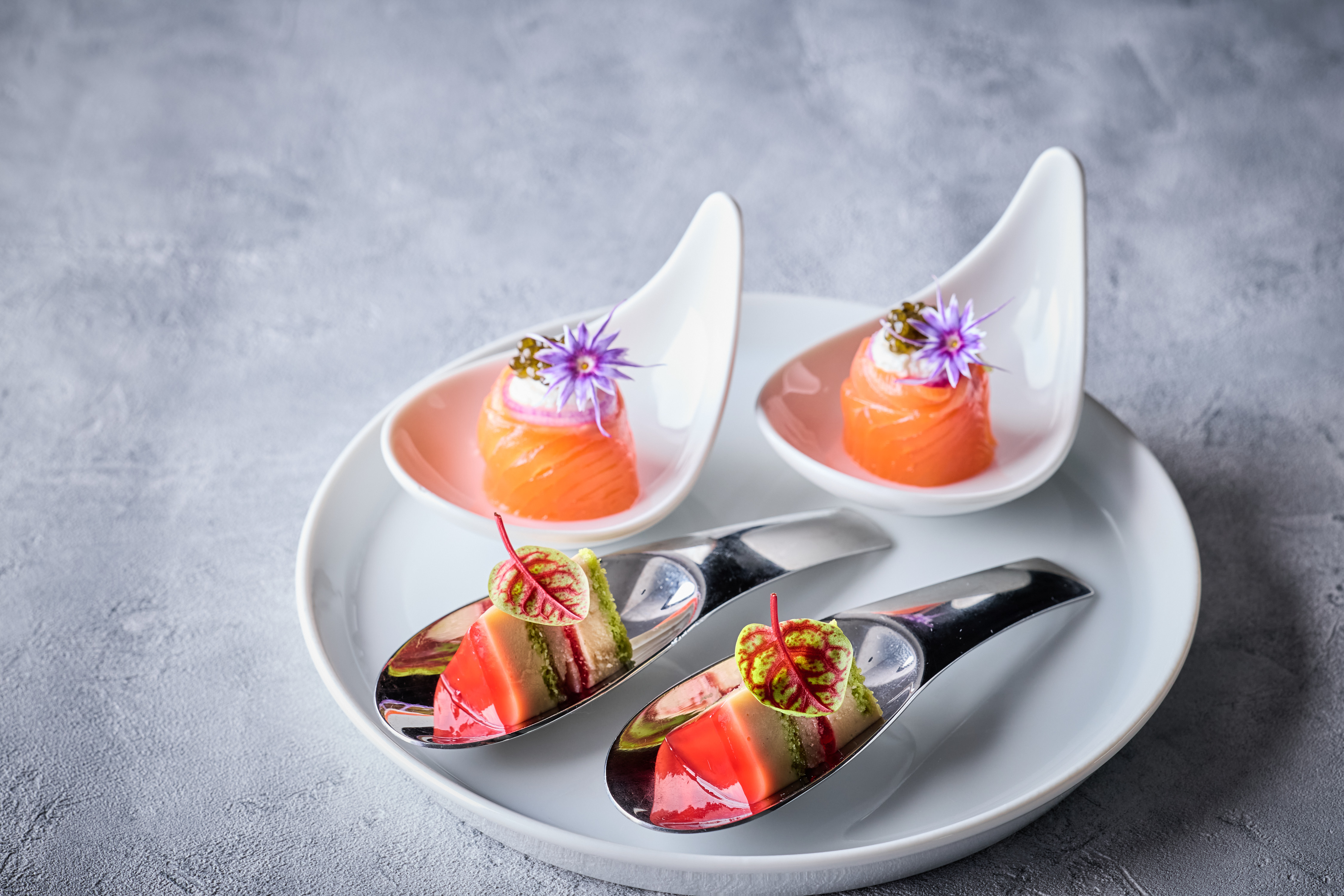 2段目には、フォアグラとグリオットチェリーのミルフィーユ仕立て、さらにサーモンマリネにオシェトラキャビアを添えた贅沢なロール。