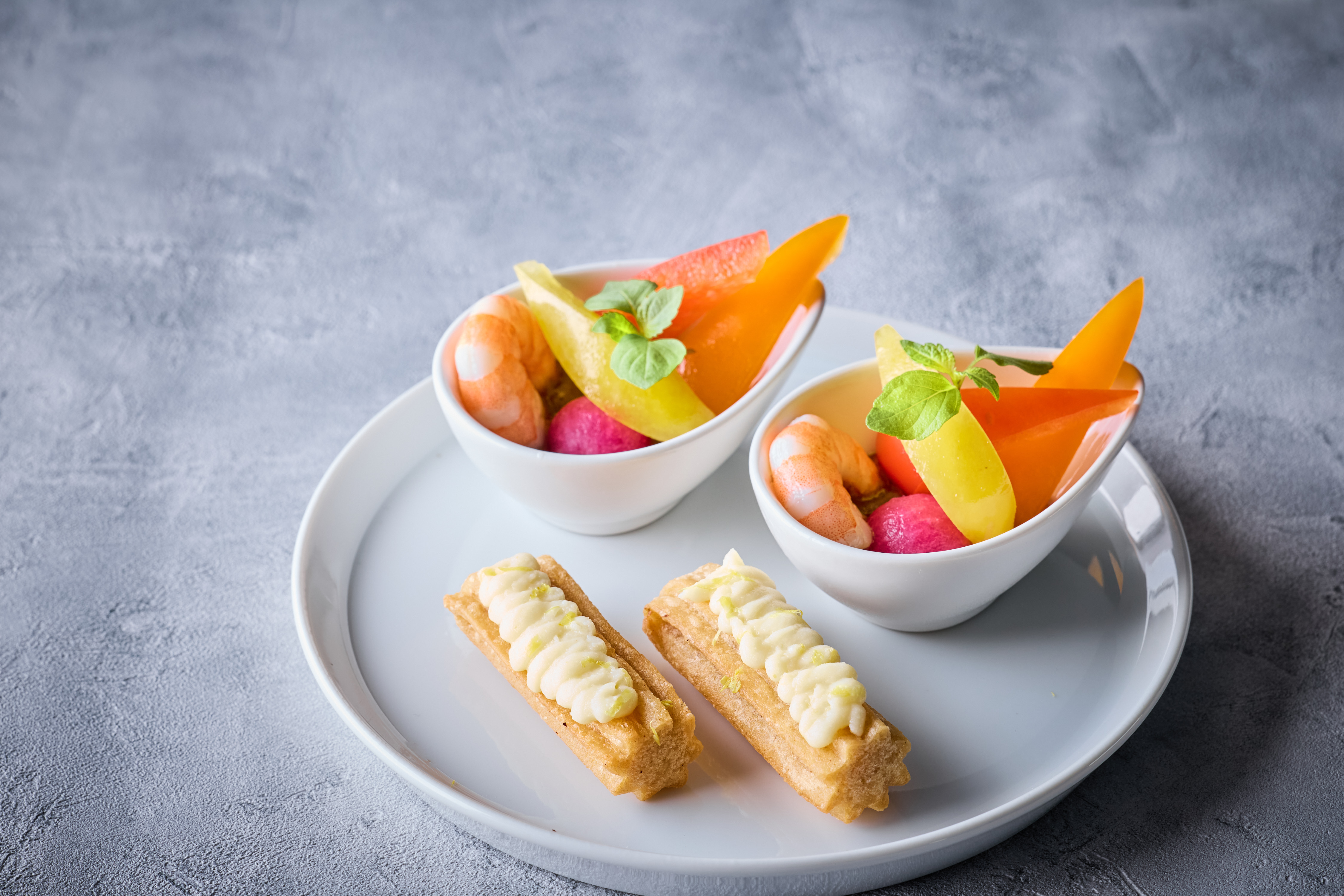 3段目には、海老マリネとカラフルベジタブル ブラックオリーブのタプナードソースや、甘じょっぱいバランスが絶妙なプチチュロス 塩レモンクリーム。