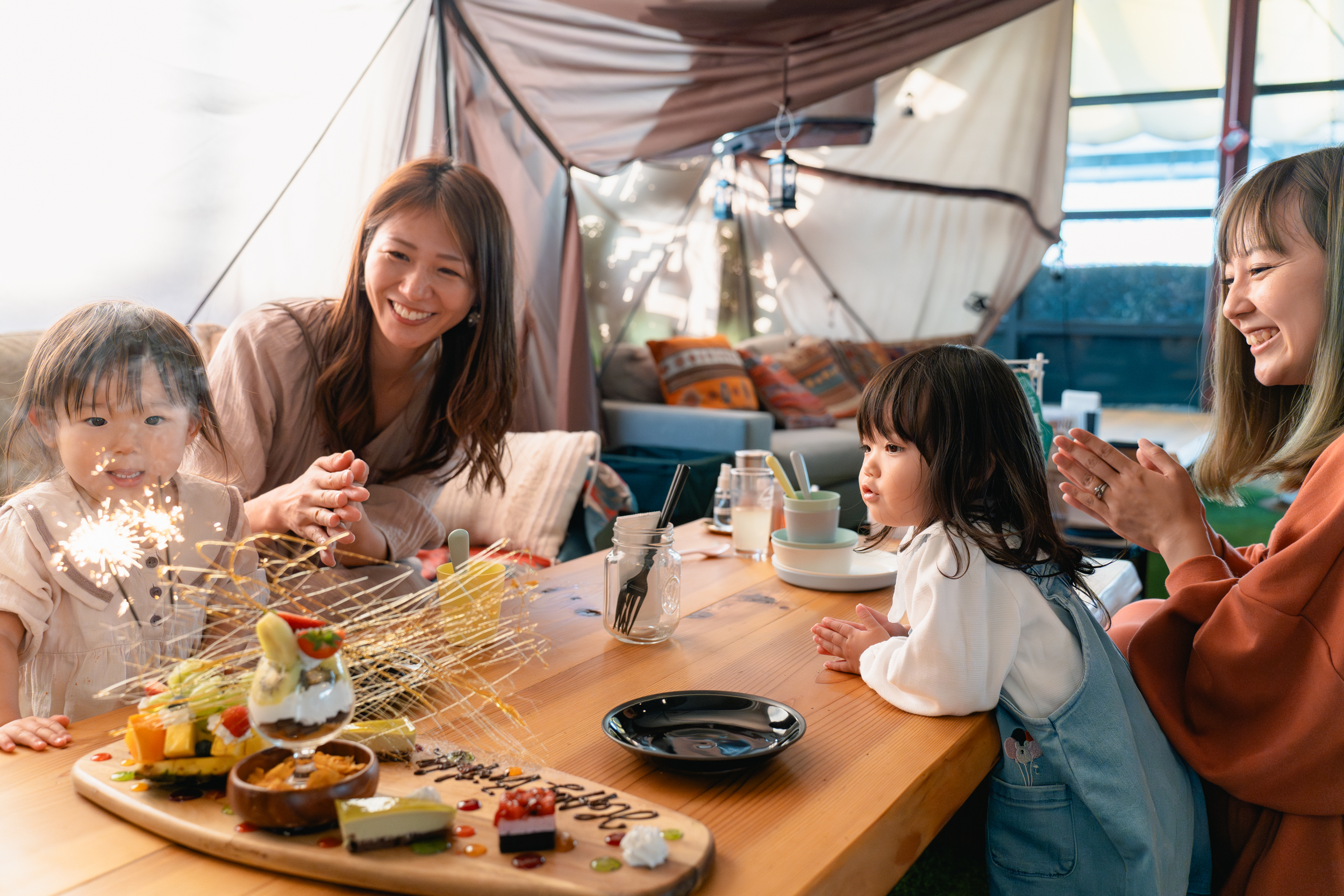 屋内だから雨風や寒さの心配はなく、大人も子ども快適に過ごせる室内キャンプ仕様。