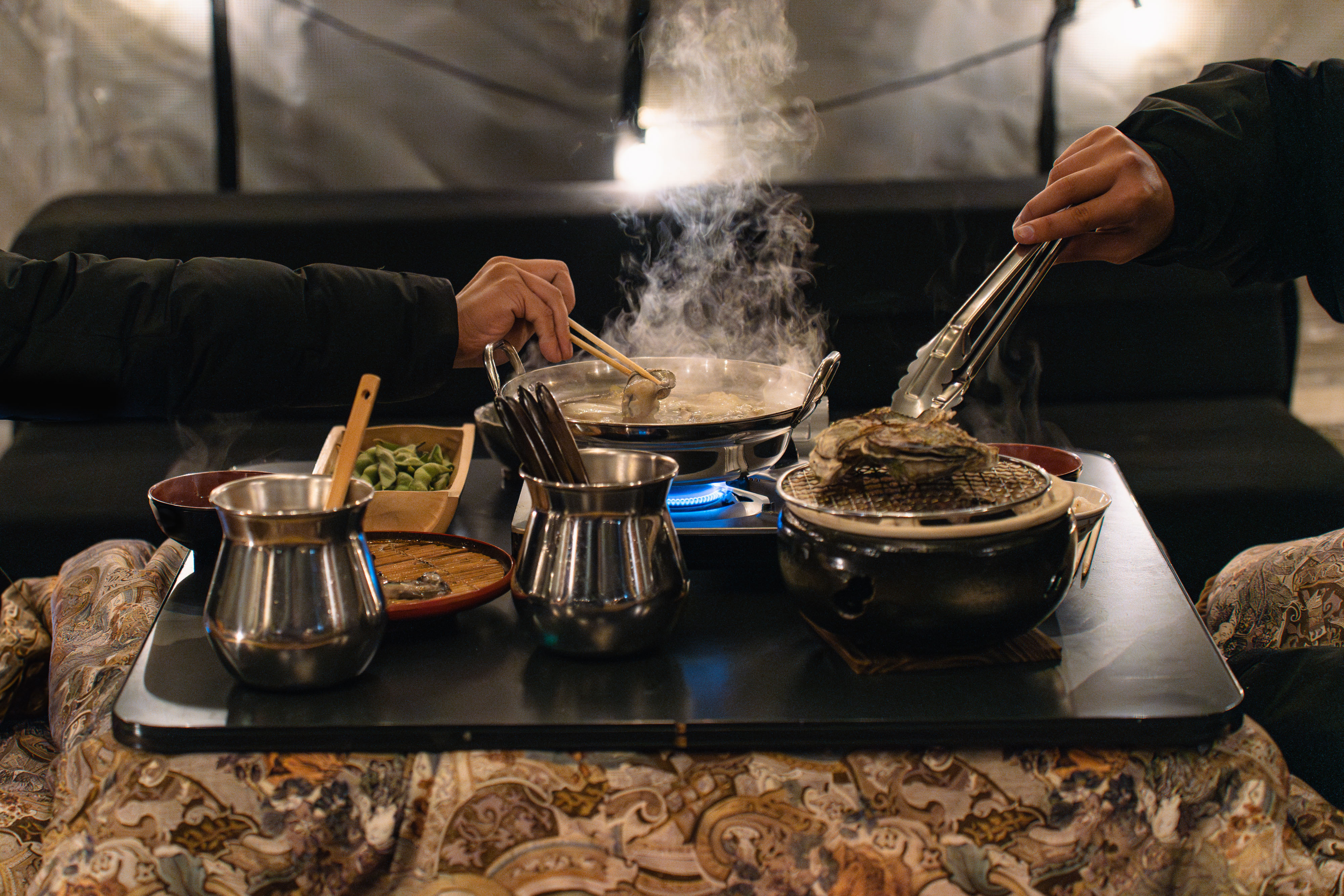 外の空気はひんやりでも、テントの中は温×旨の極楽世界です!