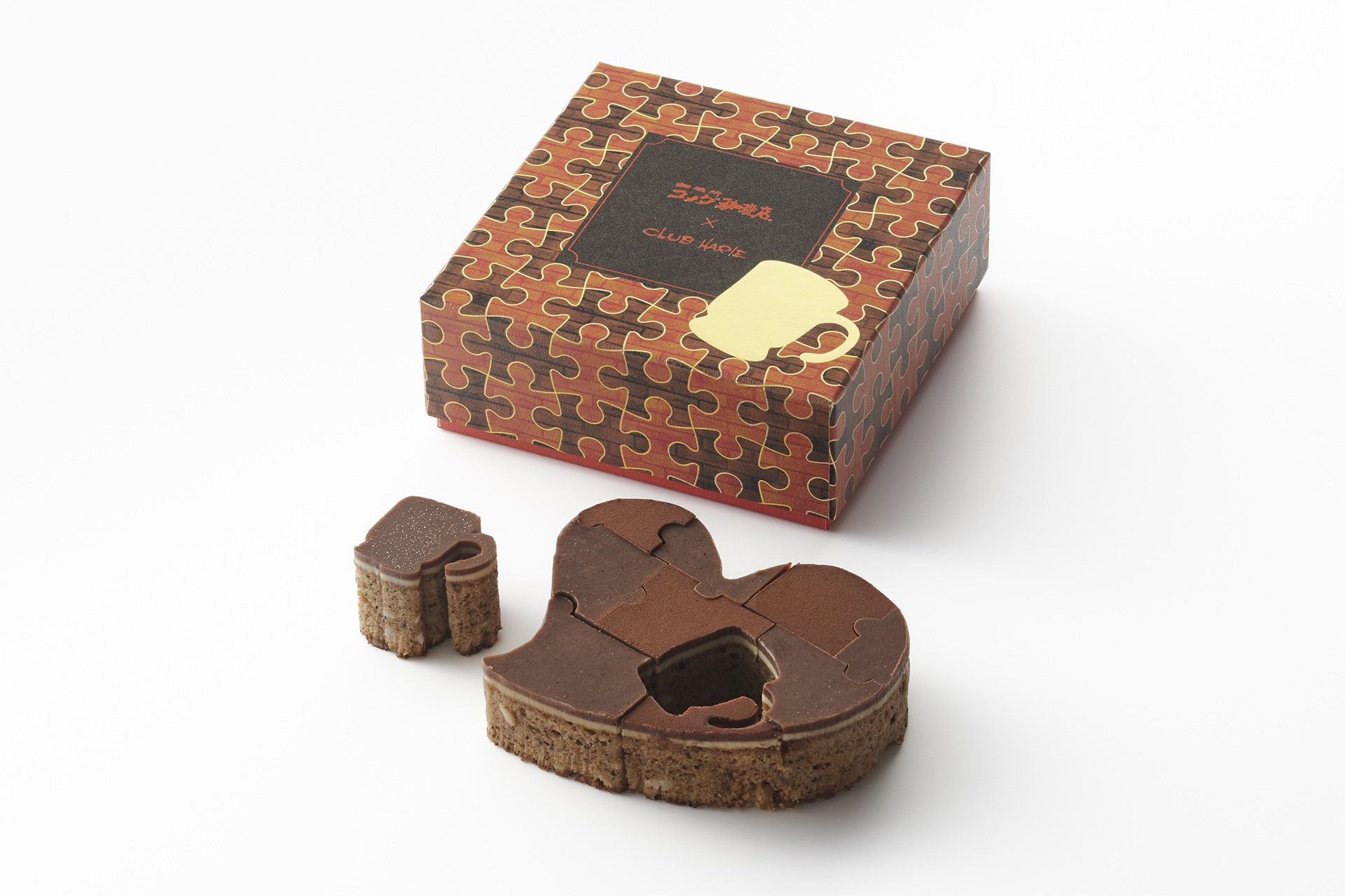ブラウニーはハート形のパズルのように切り分けでき、中央にはコーヒーカップモチーフがあしらわれ、見た目にも可愛らしい一品です。