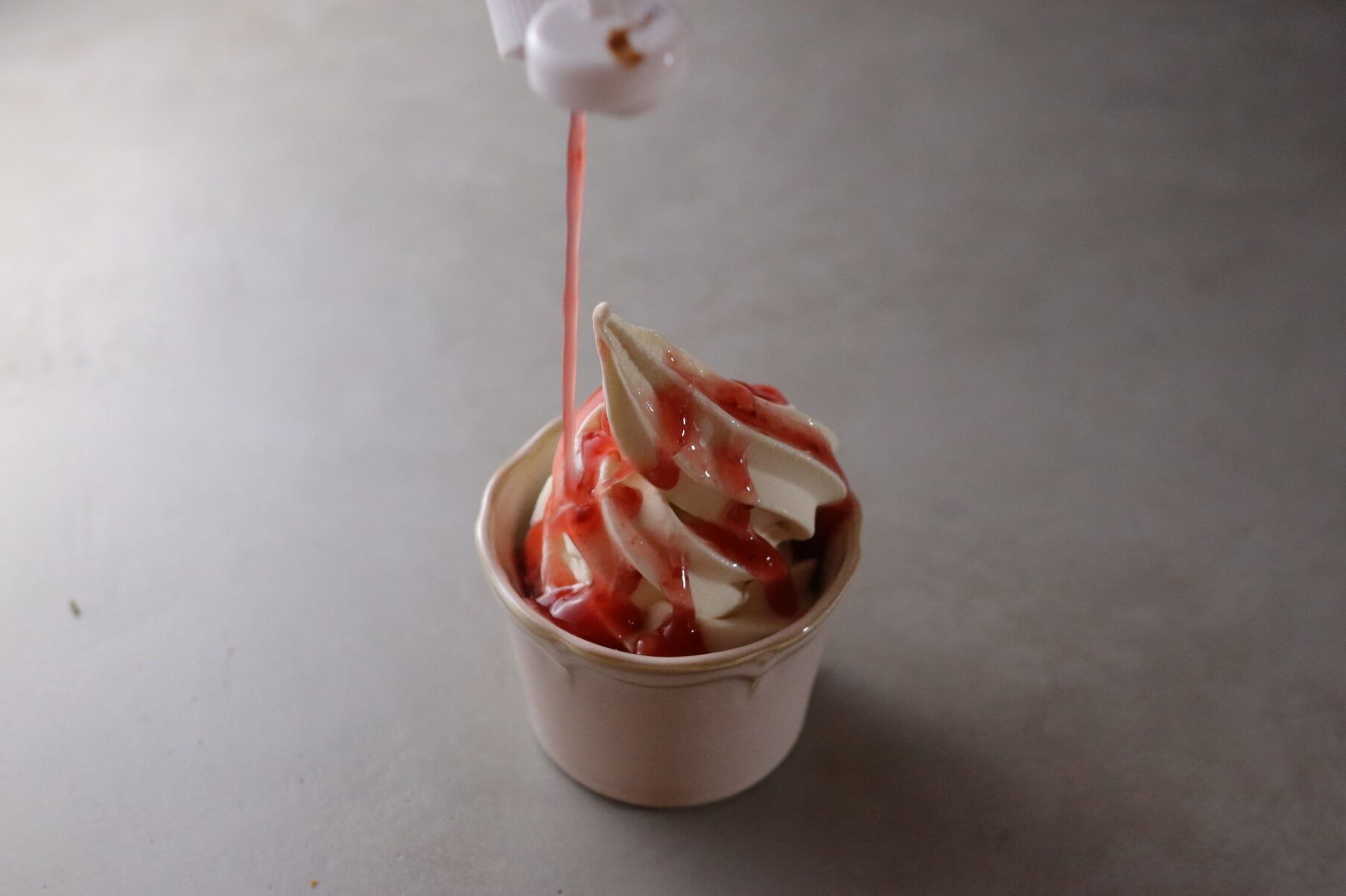本格ソフトクリームに好きなソースをトッピングして、自分だけのオリジナルパフェを作ることができます。